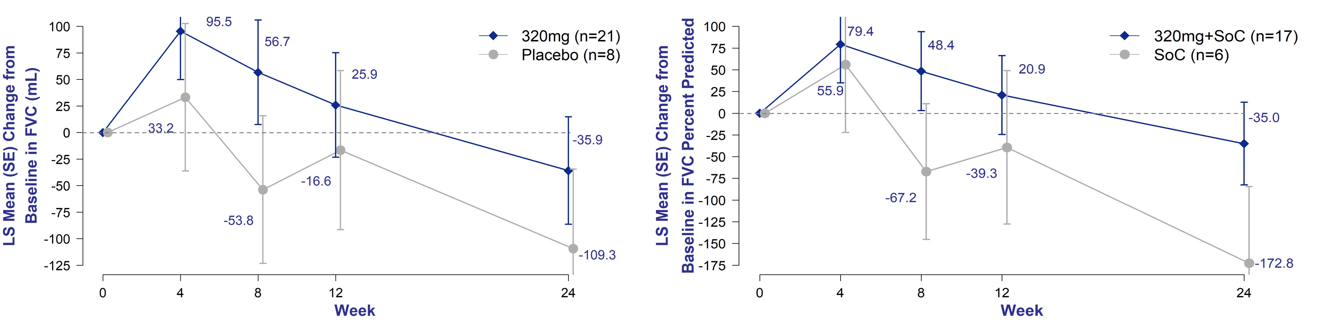 The 320 mg group enrolled 21 patients in the active arm and 8 patients in the placebo arm. Comparable to the lower dose groups, approximately 80% of enrolled patients were on standard of care and were equally distributed between nintedanib and pirfenidone.