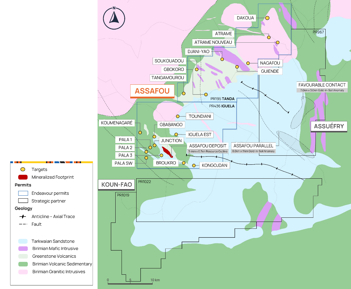 Endeavour also entered a strategic partnership over the Assuéfry and the Koun-Fao permits, located immediately to the east and south of the Assafou permit, respectively, that host similar geology s to the Assafou deposit.