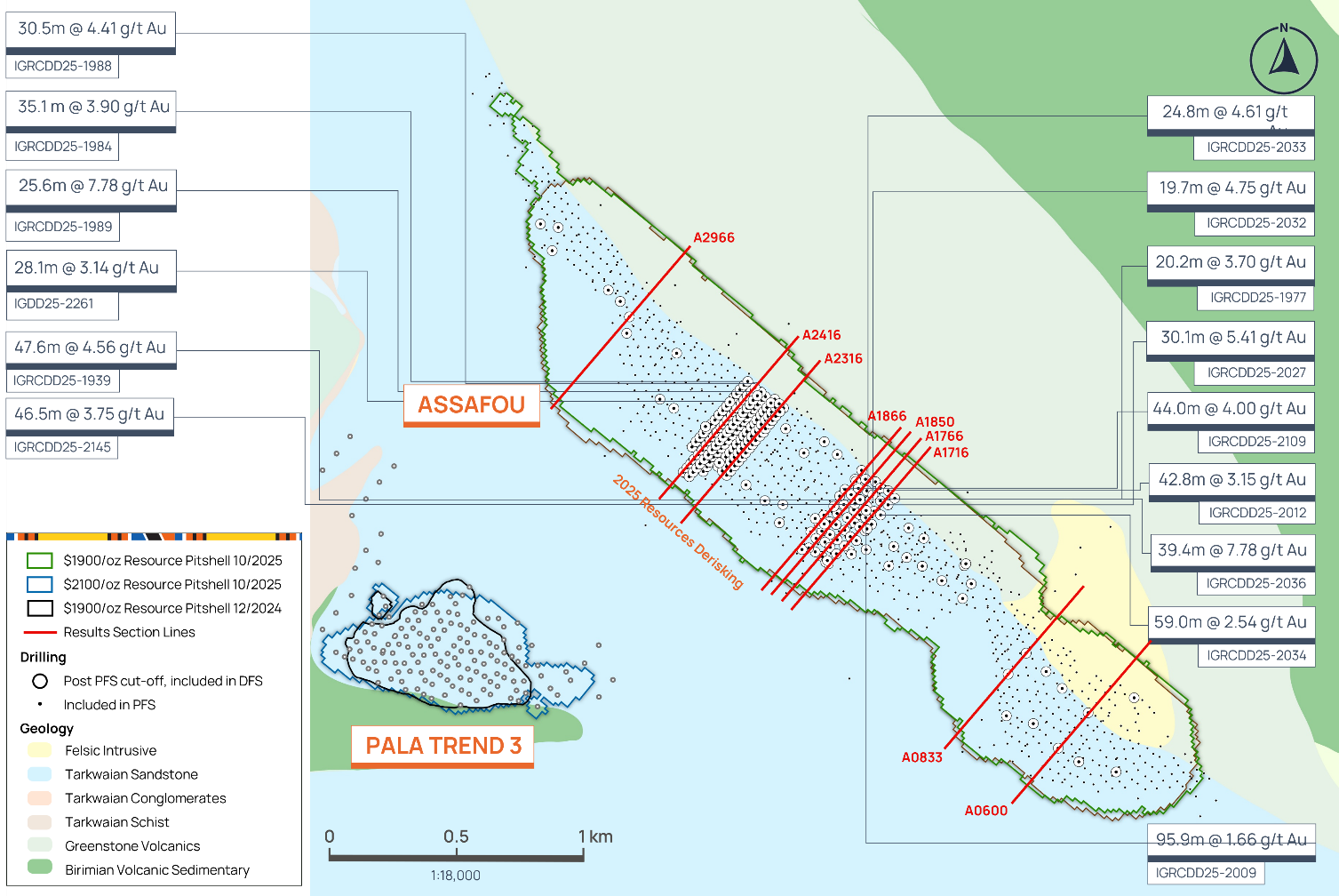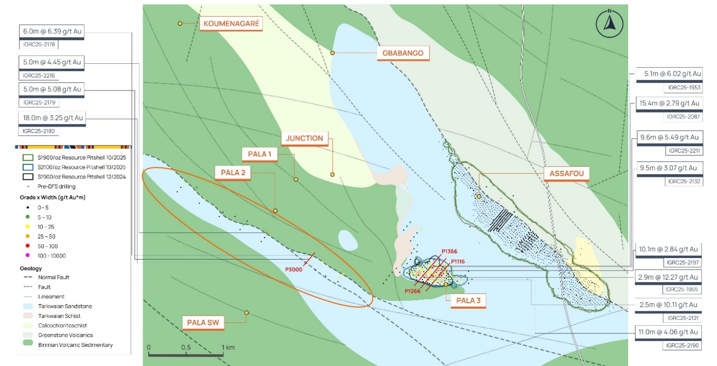 Figure 7 below highlights the additional drilling at the Assafou deposit that supports the increased reserve and resource size and confidence in the DFS. Infill and advanced grade control drilling on the Assafou deposit was completed during 2025 and reconfirmed the existing resource model, providing increased confidence in the initial phases of ore mining at the deposit. Resource definition drilling was completed at the Pala Trend 3 target located approximately 1 kilometre west of the Assafou deposit defining maiden resources.