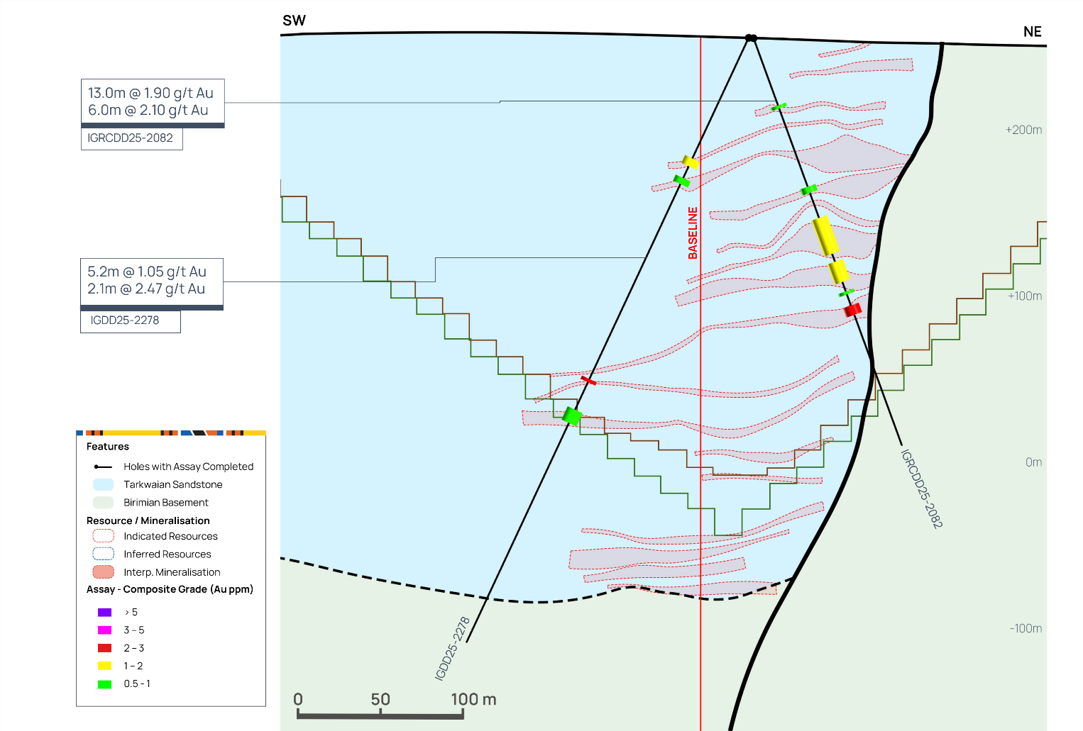 High grade mineralisation and the thickest mineralised intercepts are located adjacent to the structural contact between the mafic Birimian Basement rocks and the Tarkwaian Sandstones along the northeast boundary of the Assafou deposit.