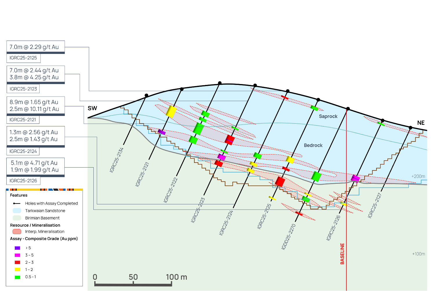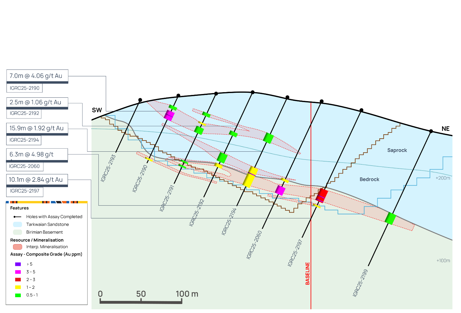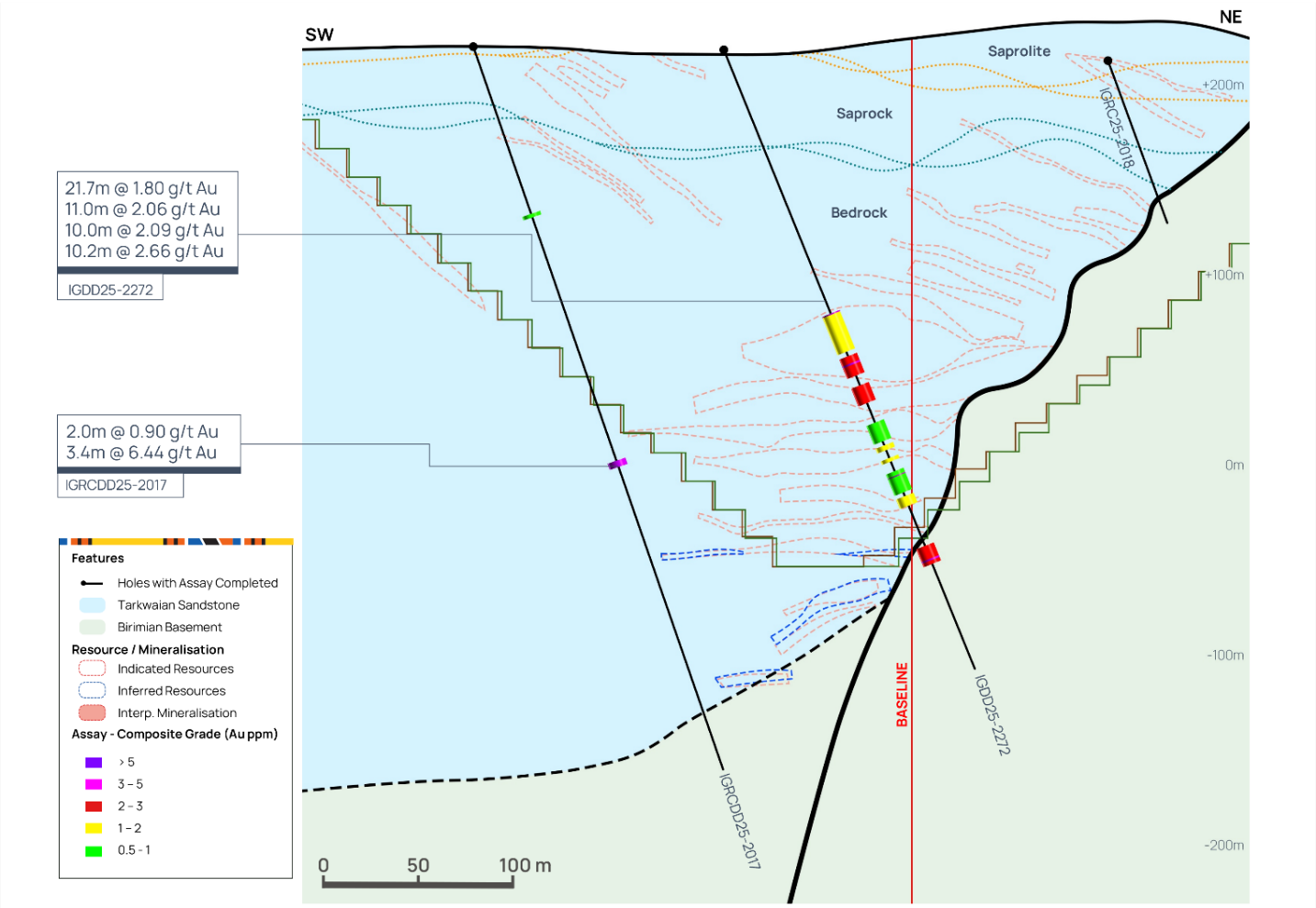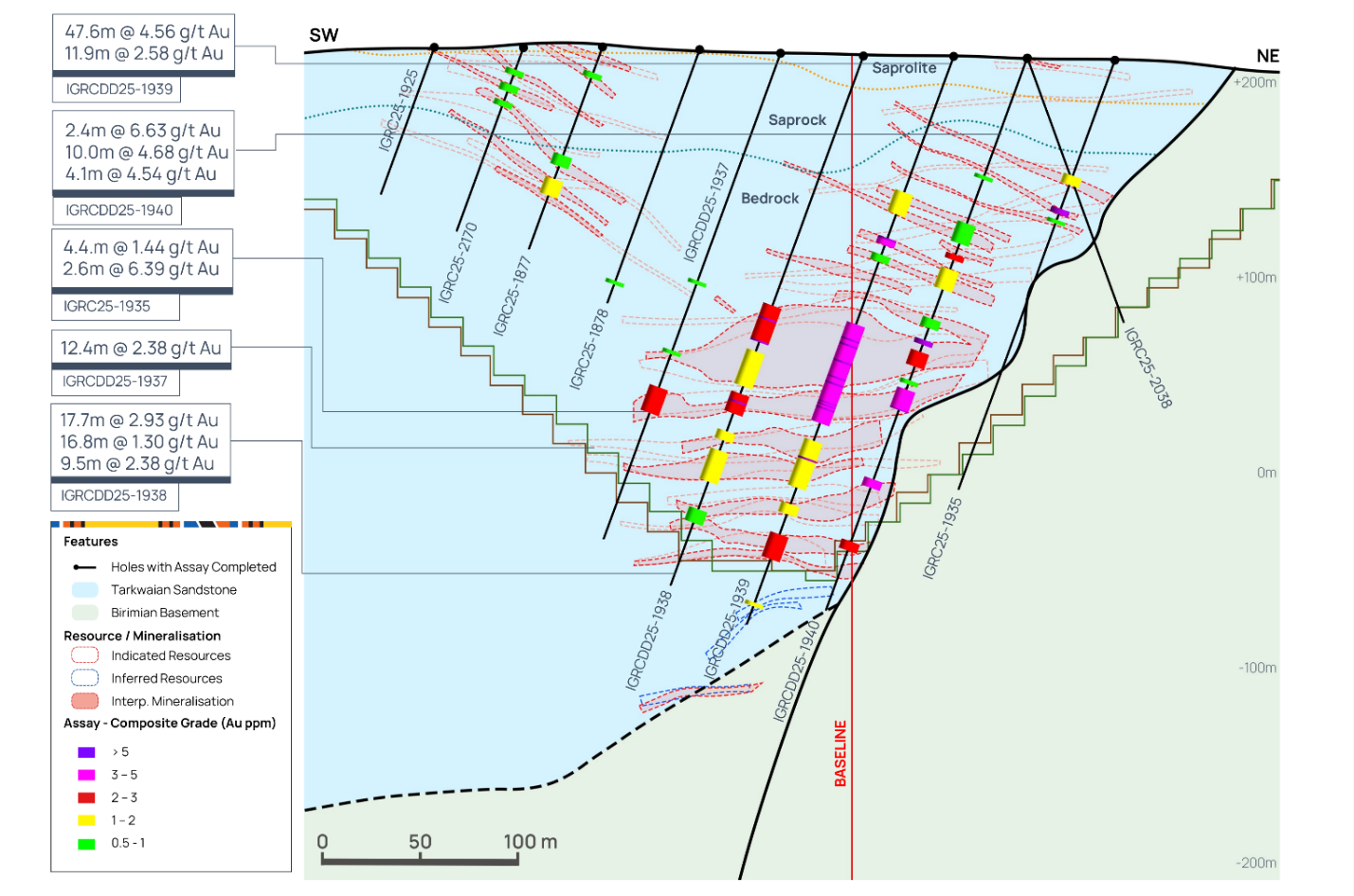 Following an extensive soil geochemistry and geological mapping campaign, several new targets in close proximity to Assafou have been identified, with planned follow up in 2026. Figure 17 below, highlights some of the high-grade mineralised intercepts identified at these potential satellite targets.