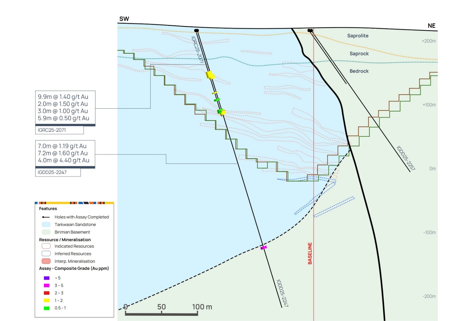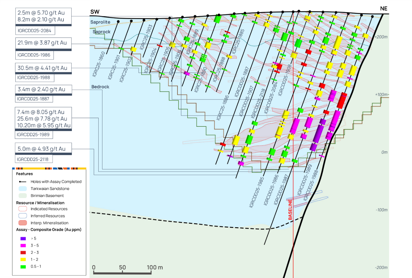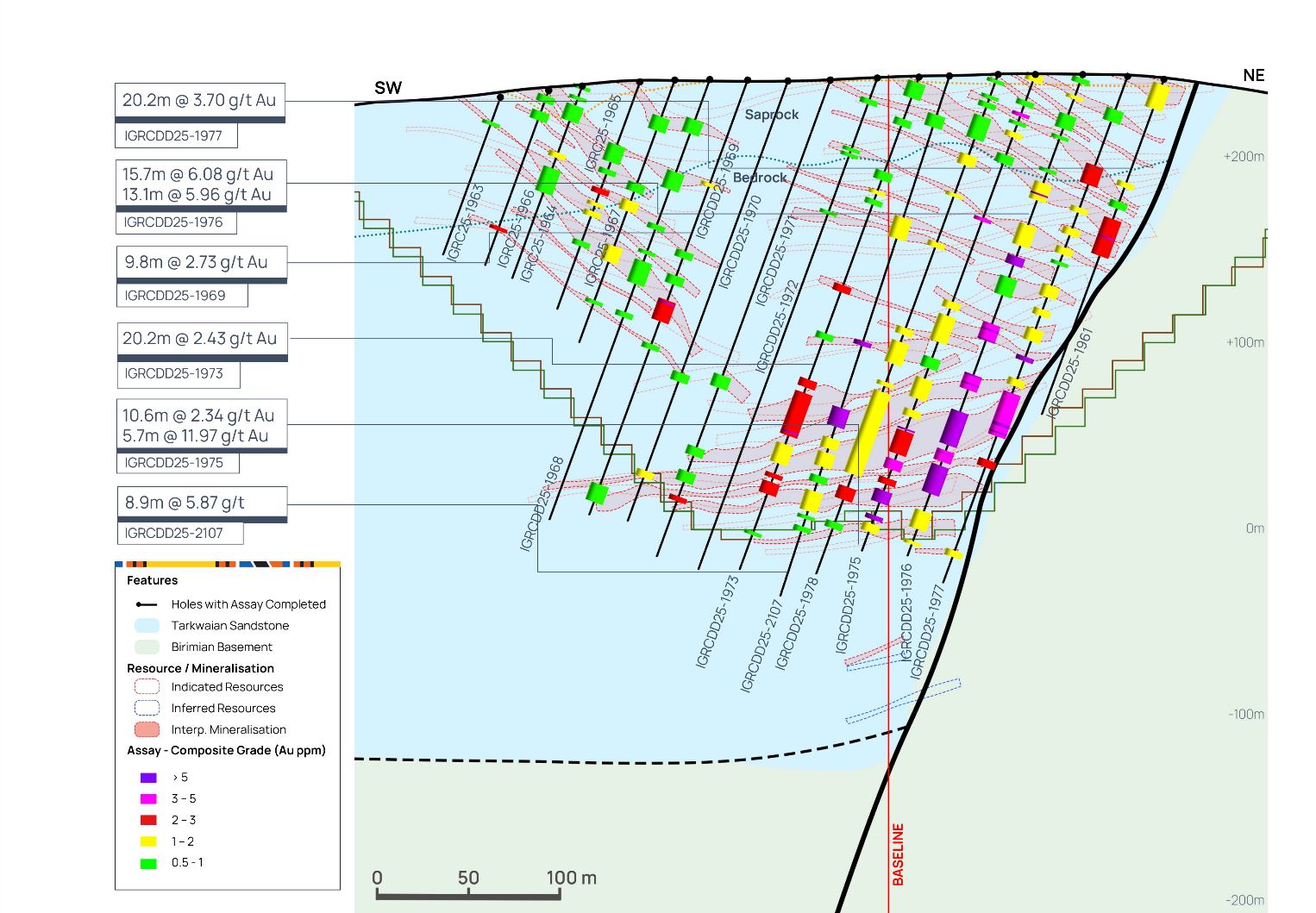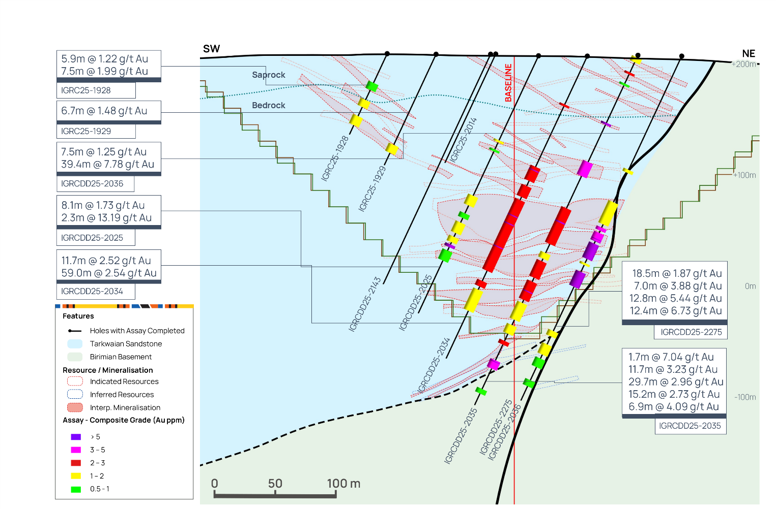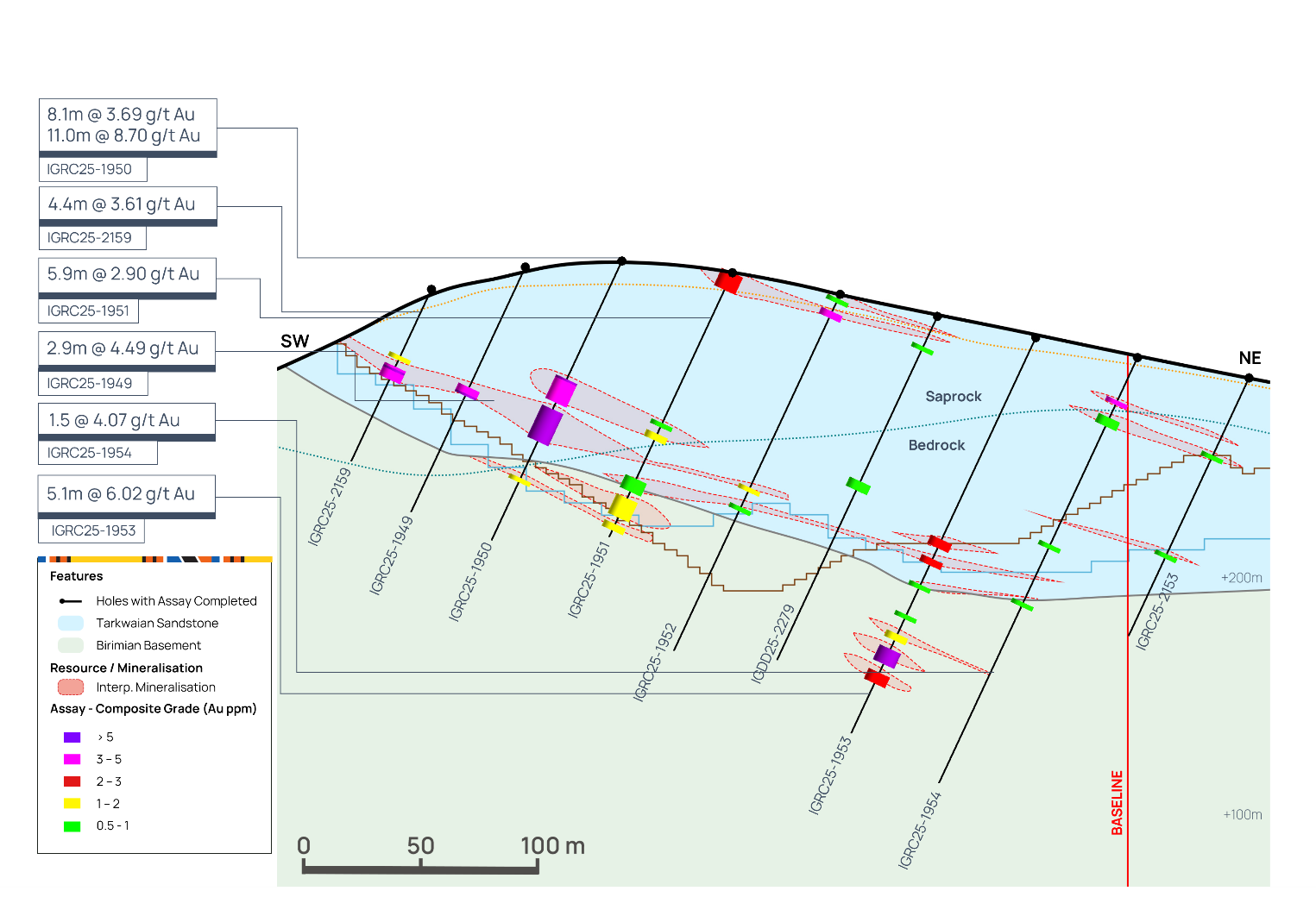 Following an extensive soil geochemistry and geological mapping campaign, several new targets in close proximity to Assafou have been identified, with planned follow up in 2026. Figure 17 below, highlights some of the high-grade mineralised intercepts identified at these potential satellite targets.