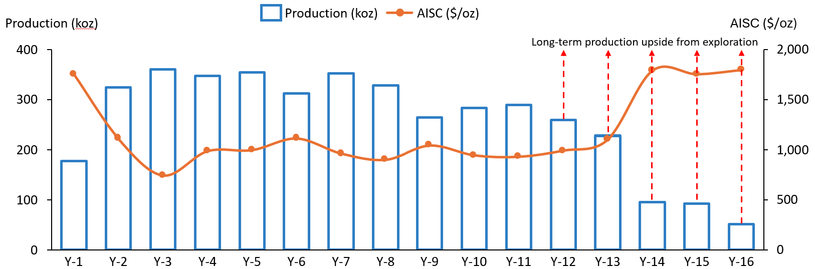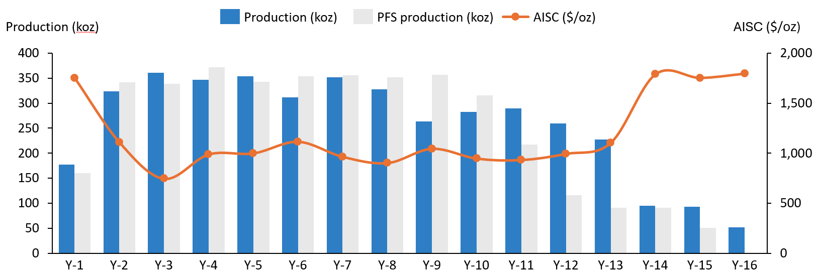 As shown in Figure 2 below, the DFS demonstrates Assafou’s potential to deliver 320kozpa at all-in sustaining cost (“AISC”) of $1,026/oz over the first eight years of operations, with average production of 257kozpa and AISC of $1,062/oz over the 16-year life of mine.