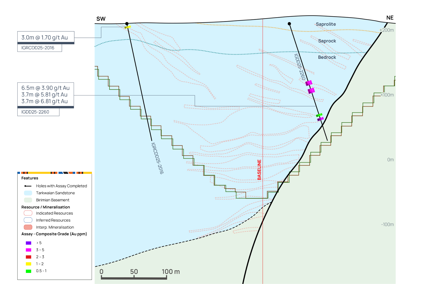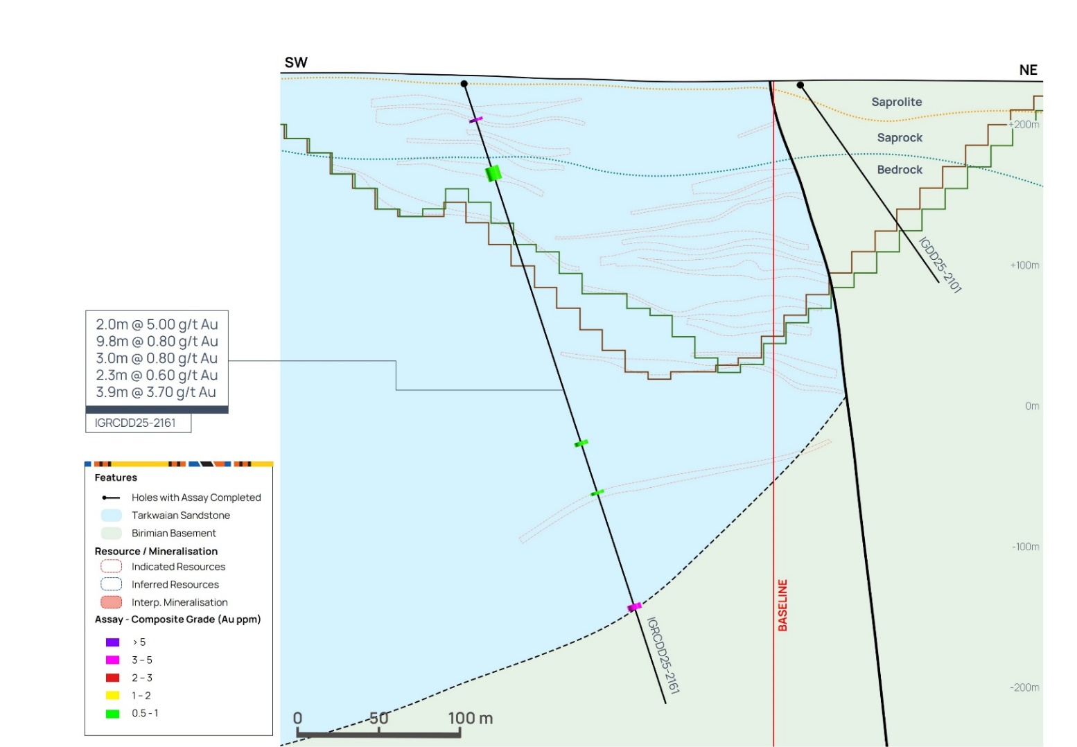 Figure 10 below highlights several thick, stacked lenses of high-grade mineralisation within the central portion of the Assafou deposit, with mineralisation extending below the resource pit shell and in some cases into the Birimian basement rocks.